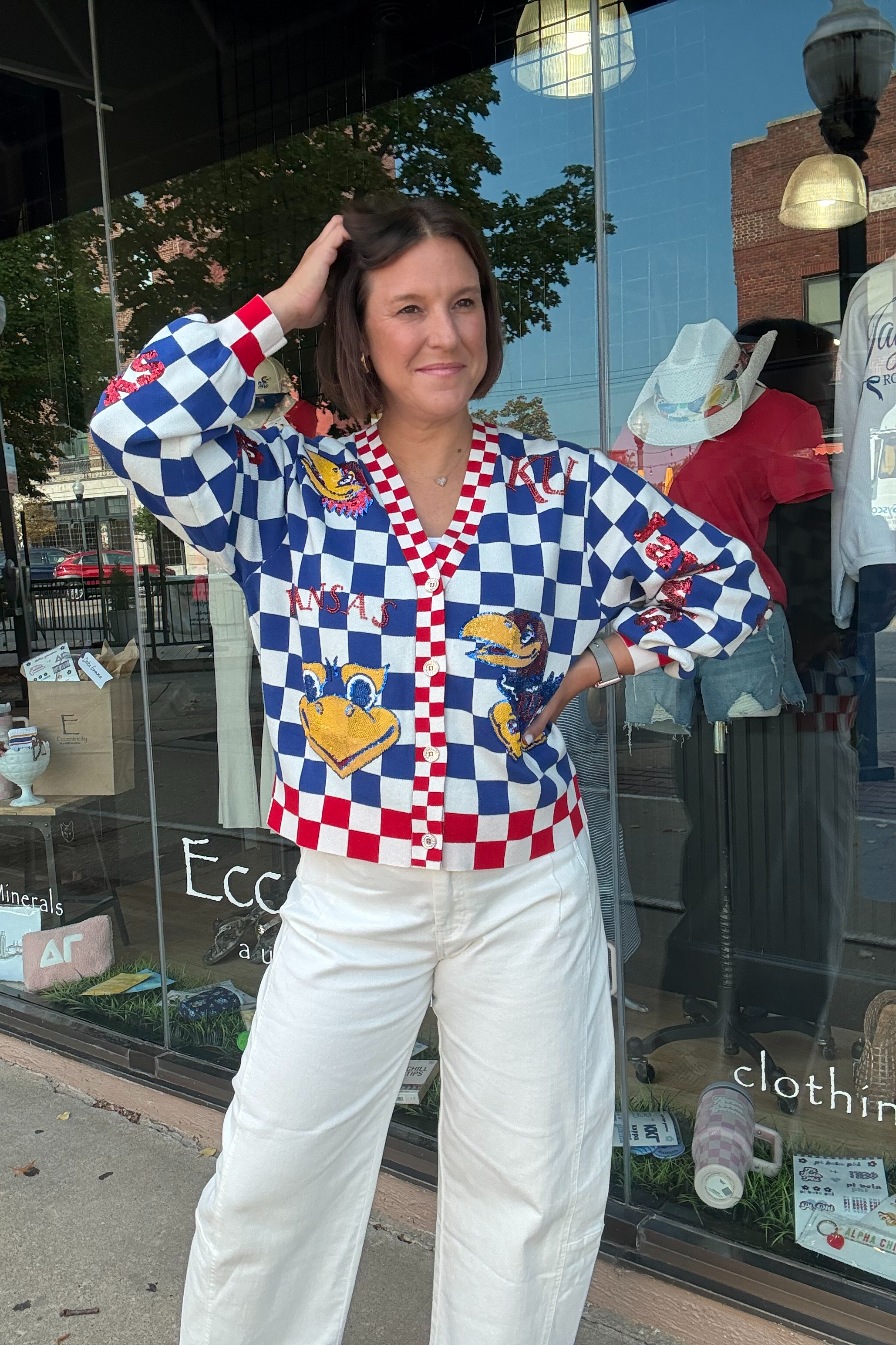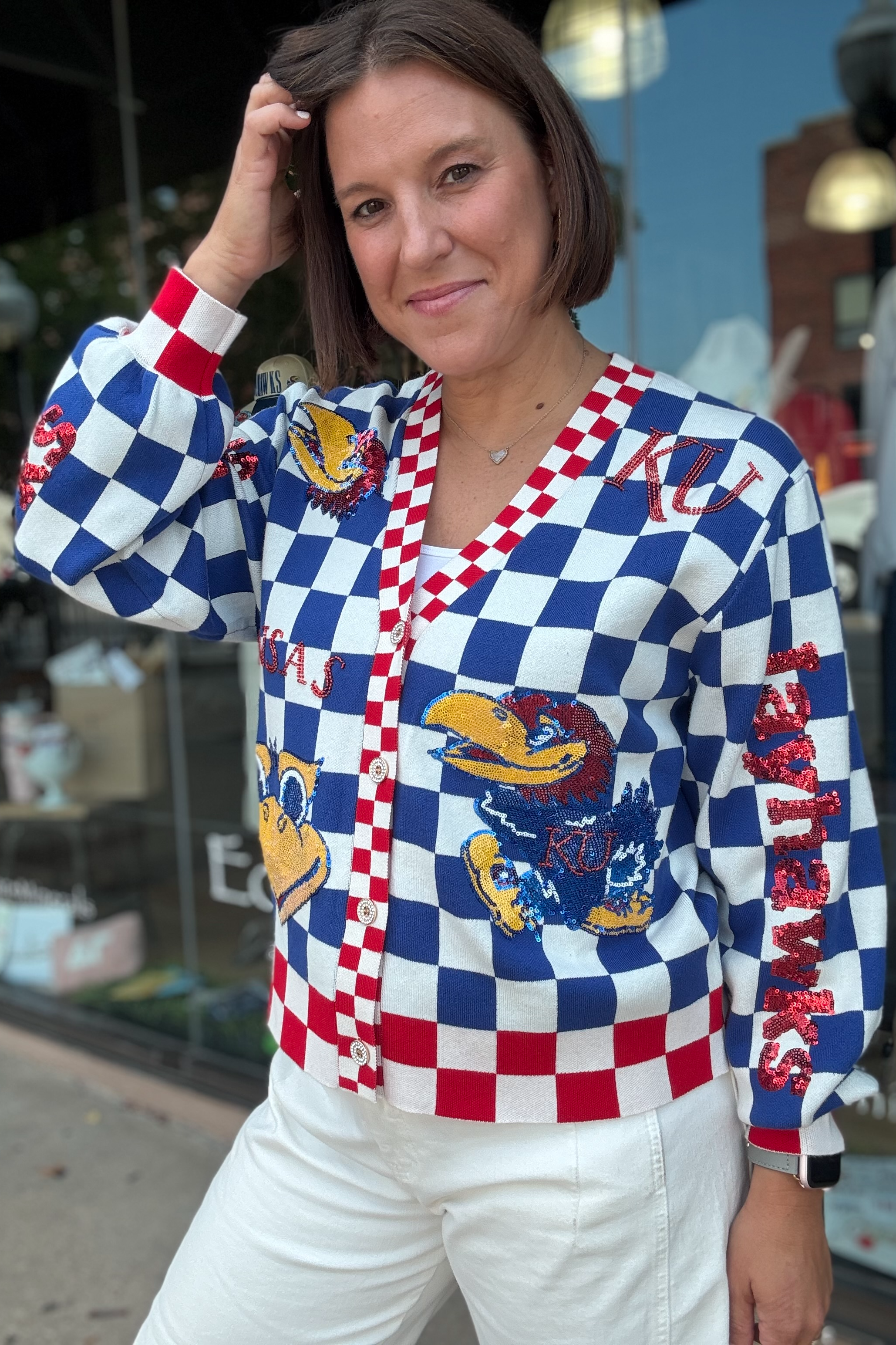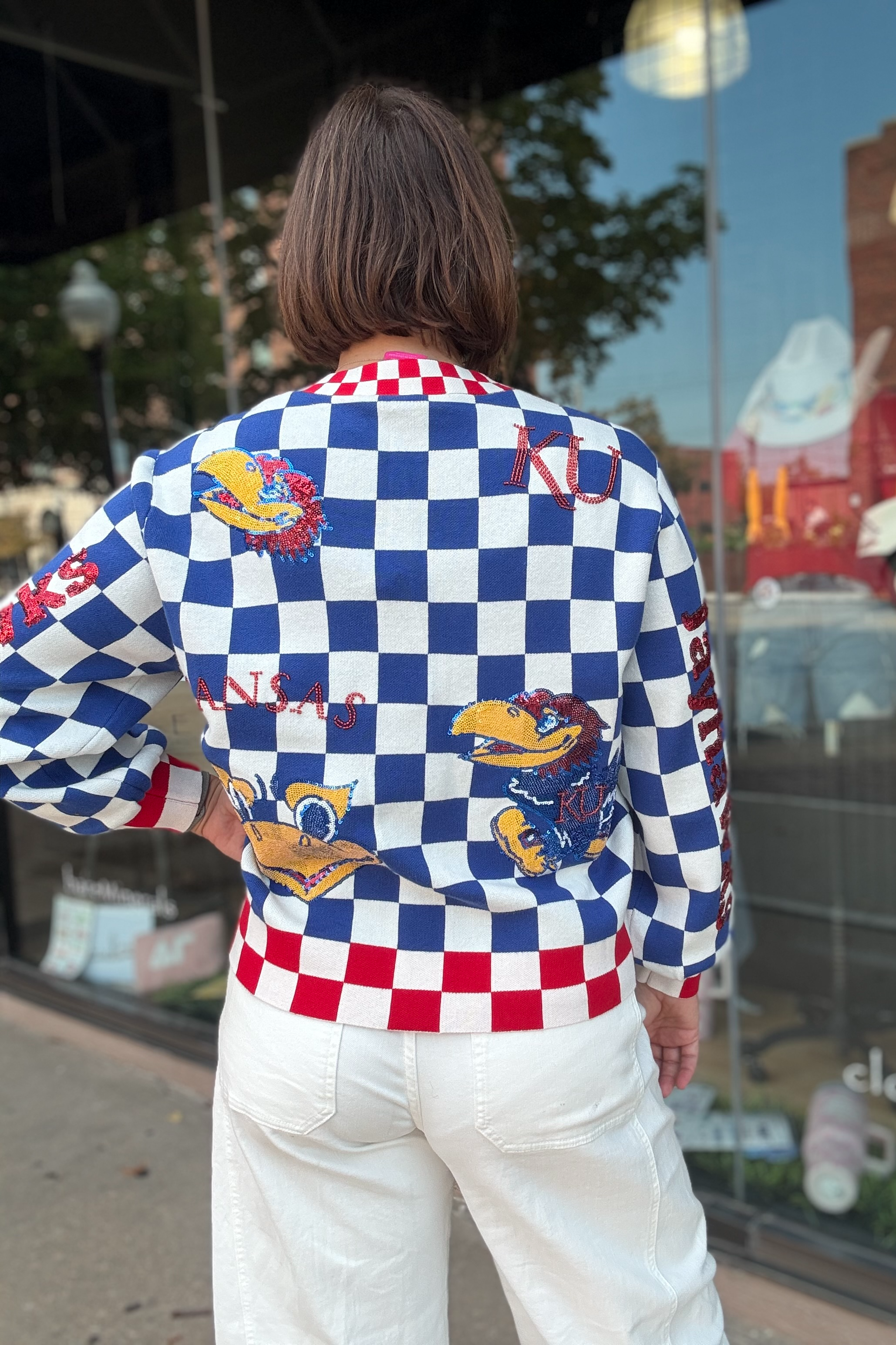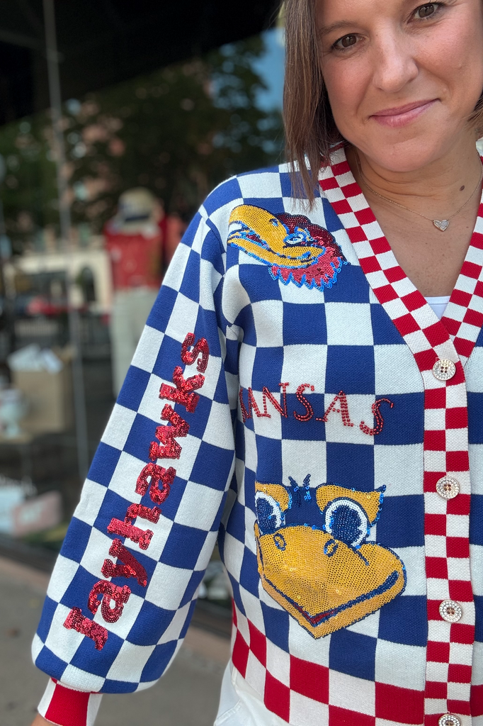Take your Jayhawk fandom to the next level with this Queen of Sparkles Checkered Cardigan. The details are just outstanding from the individually sewn sequence to the increadable soft texture. You will love this for years to come. Rock Chalk Jayhawk!