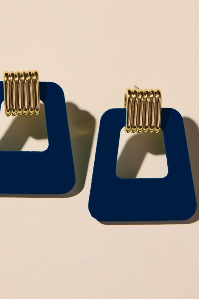 Timeless style meets a modern silhouette with the Avery earrings. This lightweight statement earring is created with premium firm Navy leather and a beveled gold stud component.