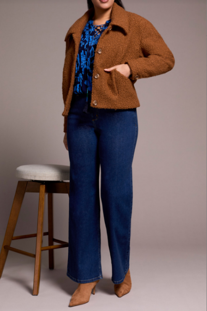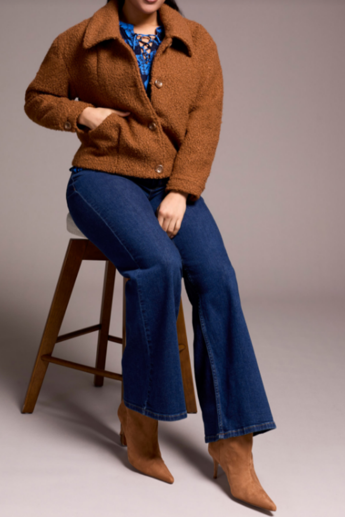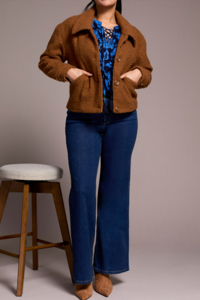 Add a touch of texture to your wardrobe with this soft boucle button-front jacket, featuring a classic button-front design and collared neckline. The boucle fabric creates a cozy, textured feel, while side pockets add functional appeal. The 24'' length offers a flattering, versatile finish, making it perfect for effortless styling.
