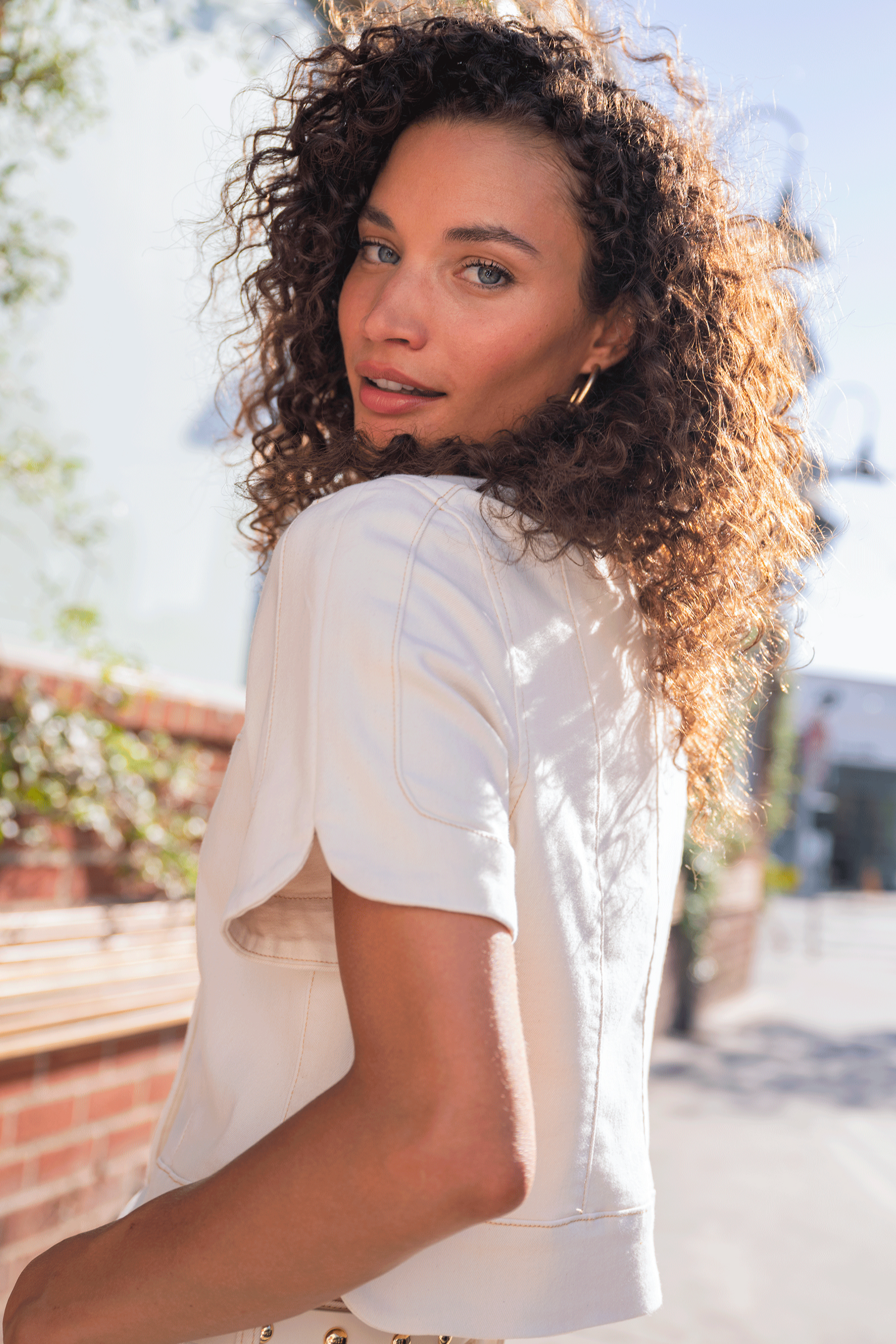 The Collarless Short Sleeve Cropped Jacket is a structured, boxy topper with a neat round neckline and oversized covered buttons. Liverpool crafted this lightweight, denim-style jacket with visible topstitching and short sleeves for a modern, polished look. Its cropped length and clean lines make it ideal for layering over high-waist pants or dresses for daytime or casual office wear. The neutral cream hue keeps the silhouette versatile and easy to style.
