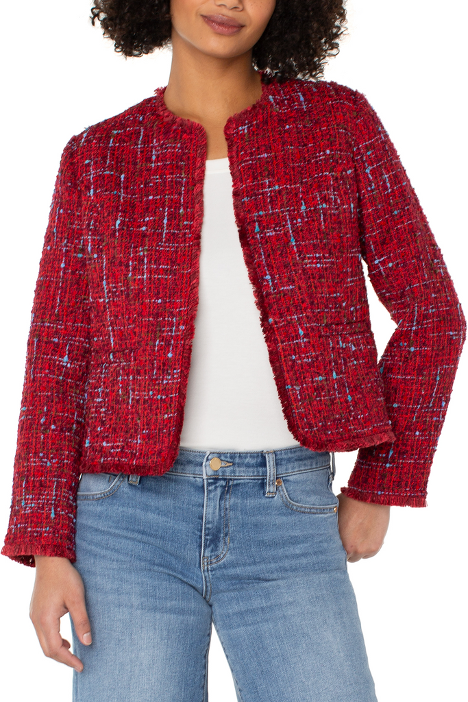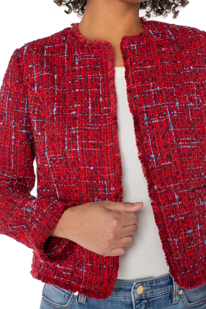 Elevate your look with this sophisticated tweed jacket, featuring a rich red weave accented with subtle flecks of blue and black. Designed with a chic collarless open front and delicate frayed trim, this cropped piece adds a touch of classic elegance to any ensemble, perfect for dressing up jeans or complementing a more formal outfit.