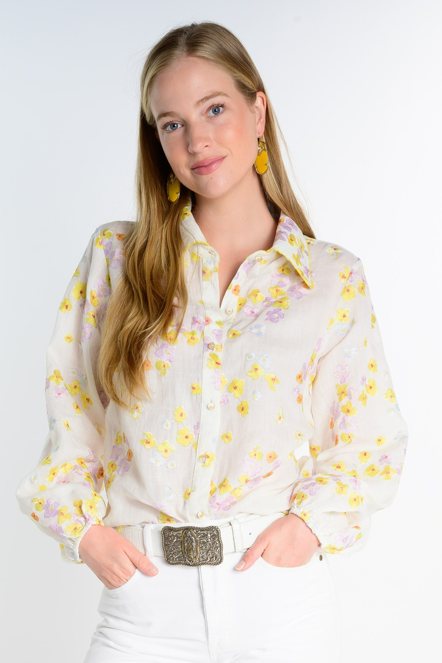 Soft, romantic, and effortlessly chic — our Embroidered Floral Shirt is a fresh take on everyday elegance. Featuring a delicate yellow and lavender floral print on a lightweight, semi-sheer fabric, this long sleeve top is perfect for layering or wearing as-is on sunny days. The relaxed fit, button front, and classic collar offer timeless versatility, while the subtle balloon sleeves add a gentle, feminine flair. Pair it with denim or white trousers for a light and airy springtime look.