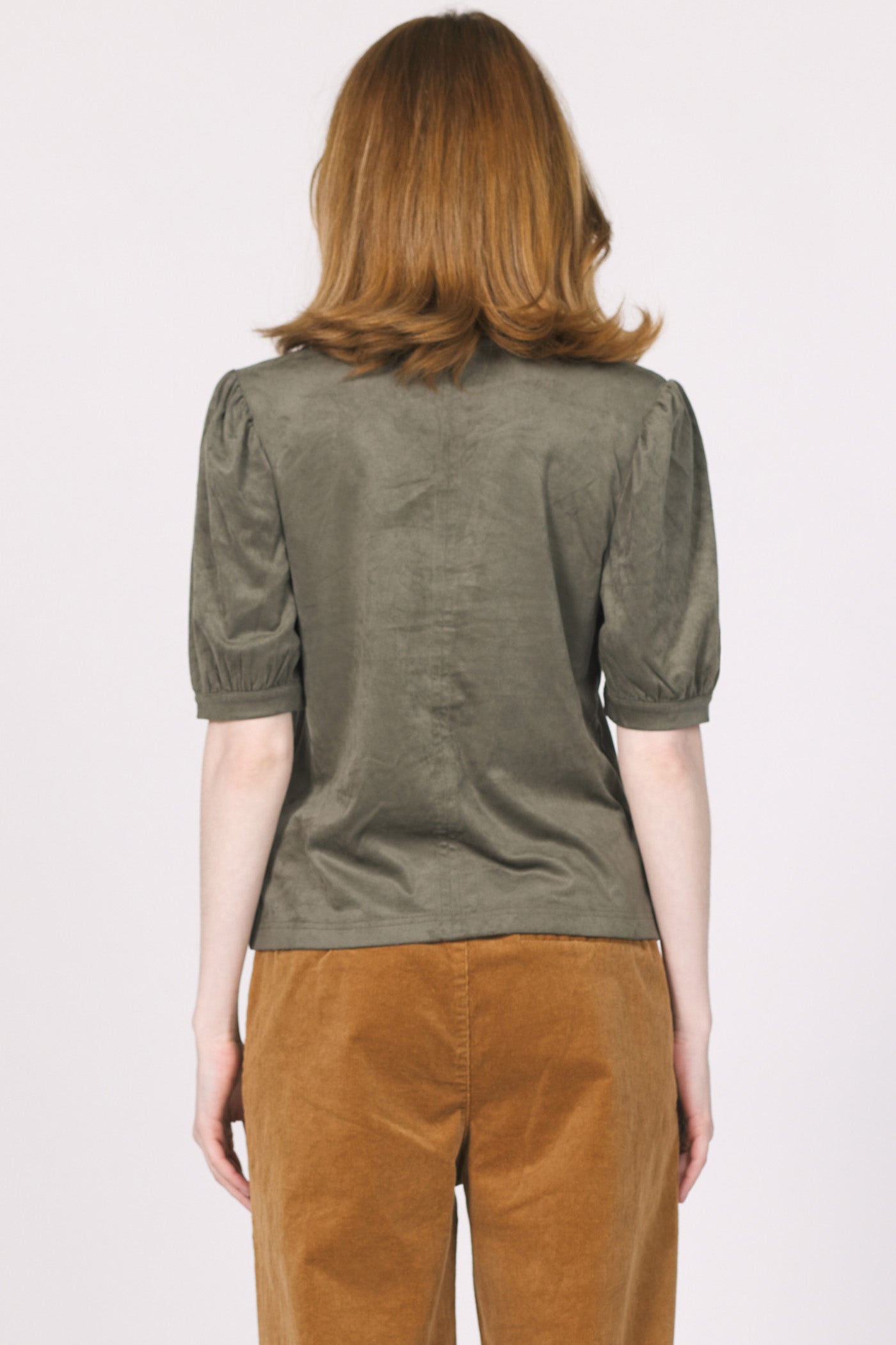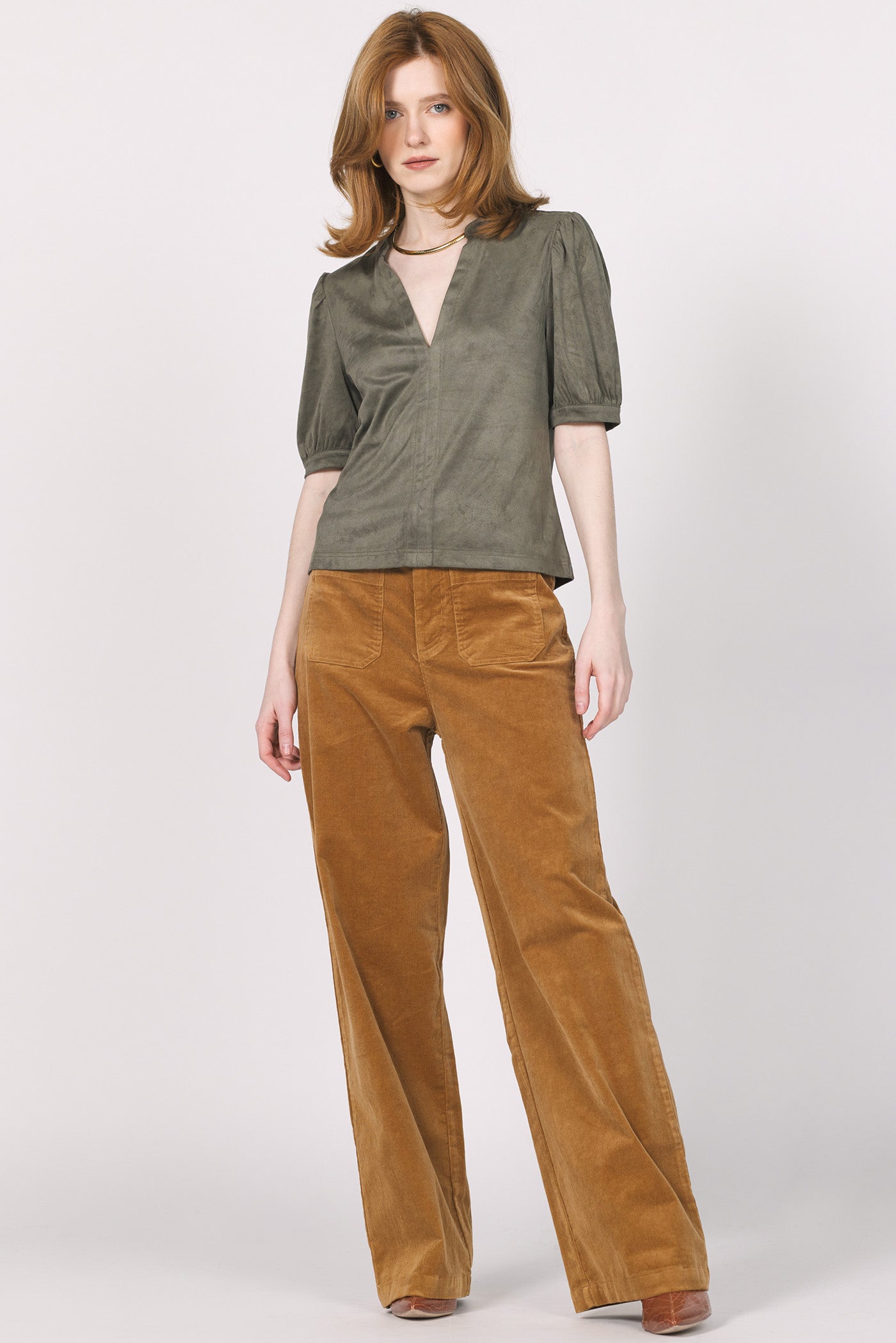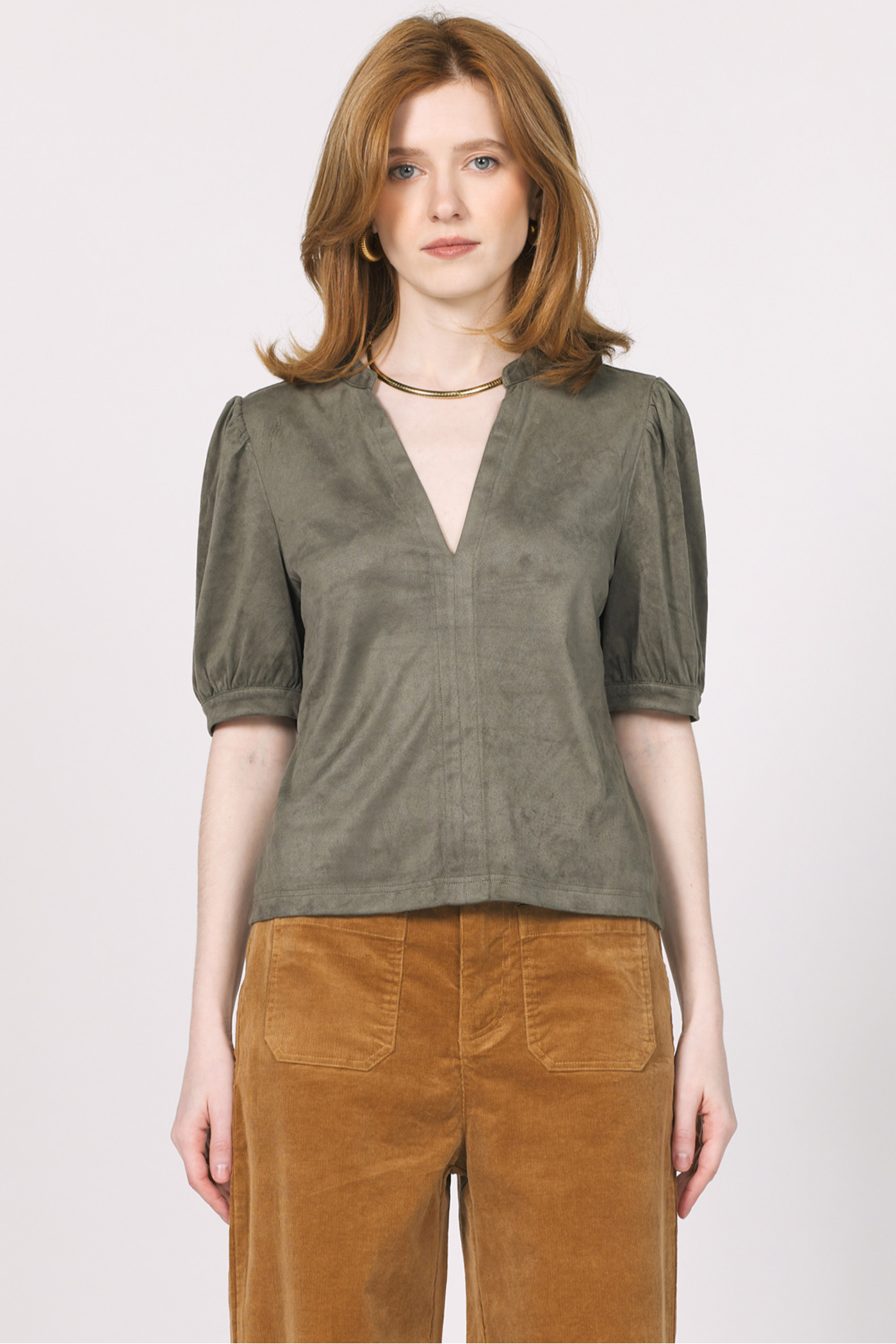 Effortlessly chic and supremely soft, Another Love's Kalia Faux Suede Top is a versatile staple for any wardrobe. This elegant top features a flattering V-neckline and subtle puff sleeves that add a touch of modern sophistication. Crafted from a luxurious faux suede fabric in a rich, earthy tone, it offers a comfortable fit with a refined texture. Perfect for both office and casual wear, pair it with tailored trousers for a polished look or with your favorite jeans for an elevated everyday style.