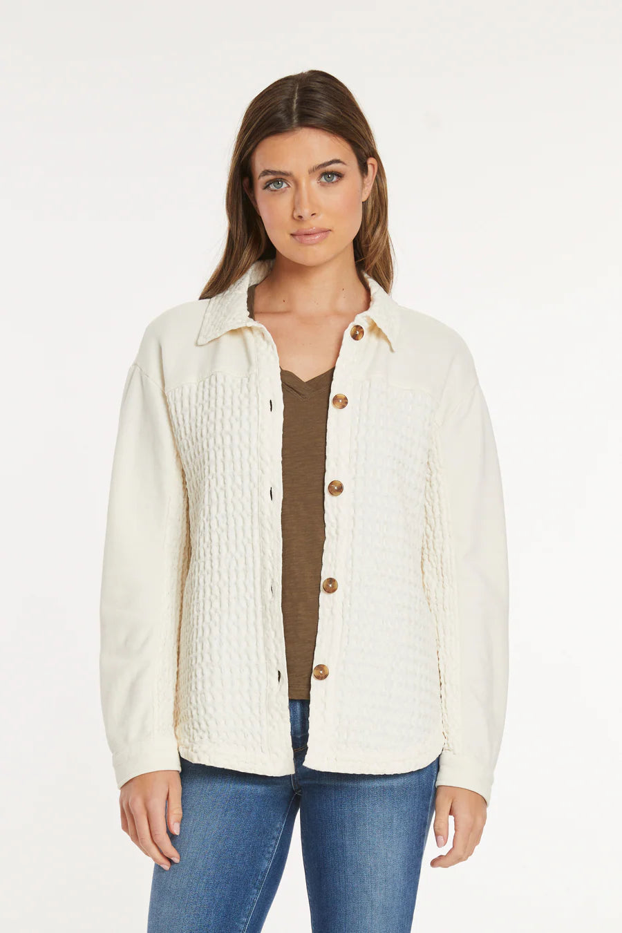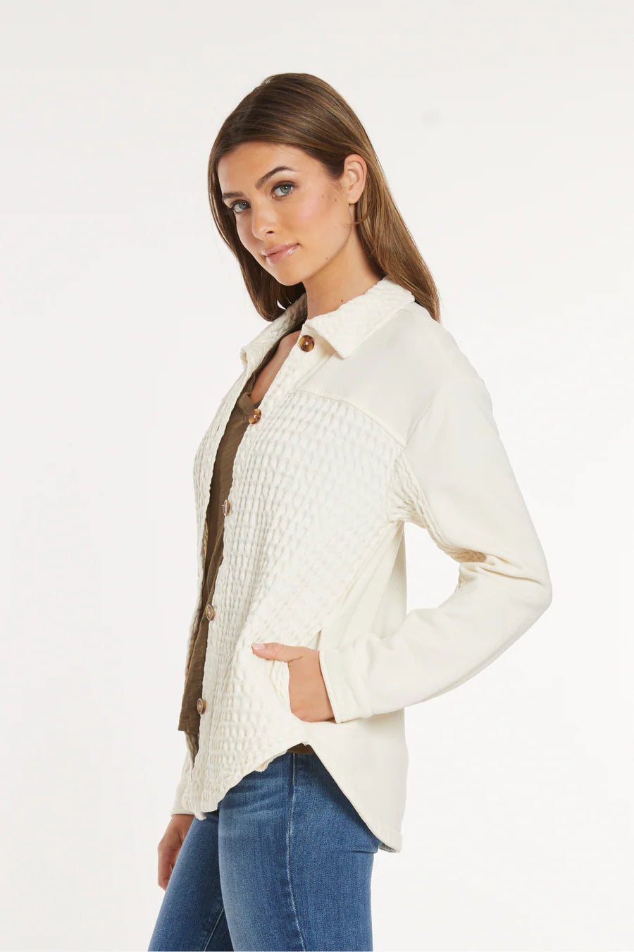 This textured "shacket" is a stylish and practical addition to your wardrobe. Featuring a blend of smooth and textured fabric in an off-white color, it has a classic collar, button-front closure, and convenient side pockets. Wear it as a light jacket or a warm overshirt for a comfortable and chic look.