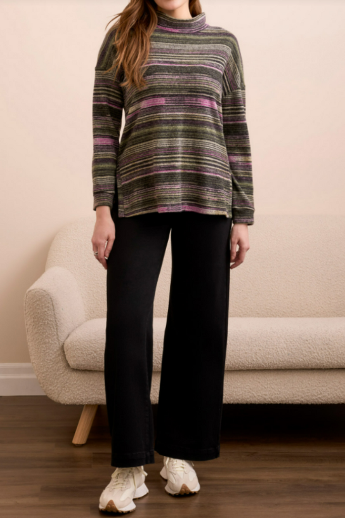 Embrace effortless style with our Multi-Stripe Mock Neck Top. This cozy yet chic top features a sophisticated mock neck and a vibrant array of horizontal stripes in rich, earthy tones like olive green, plum, and charcoal. The relaxed fit and soft, breathable fabric ensure comfort all day long, while the varied stripe pattern adds a modern and dynamic touch. Perfect for transitioning between seasons, this versatile piece can be dressed down with your favorite denim or paired with tailored trousers for a more polished ensemble.