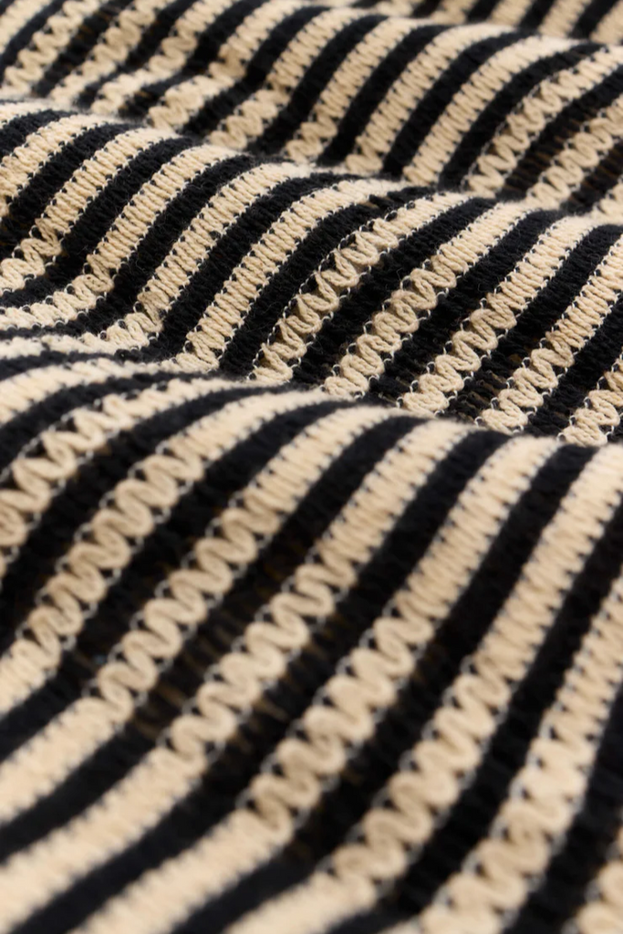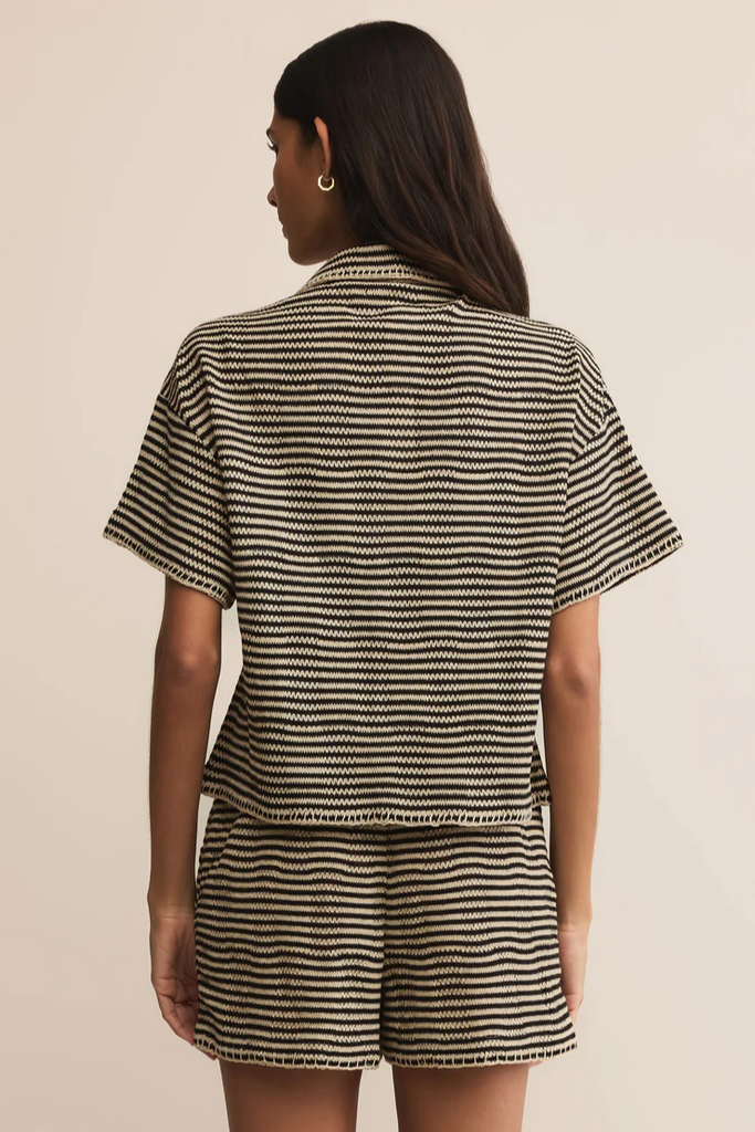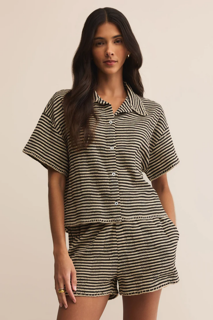Textured and one-of-a-kind, this woven button-up brings vintage charm to any look. A cropped, boxy fit and blanket stitch details add the perfect finishing touch. Pair with the matching Arezzo shorts for the full outfit!