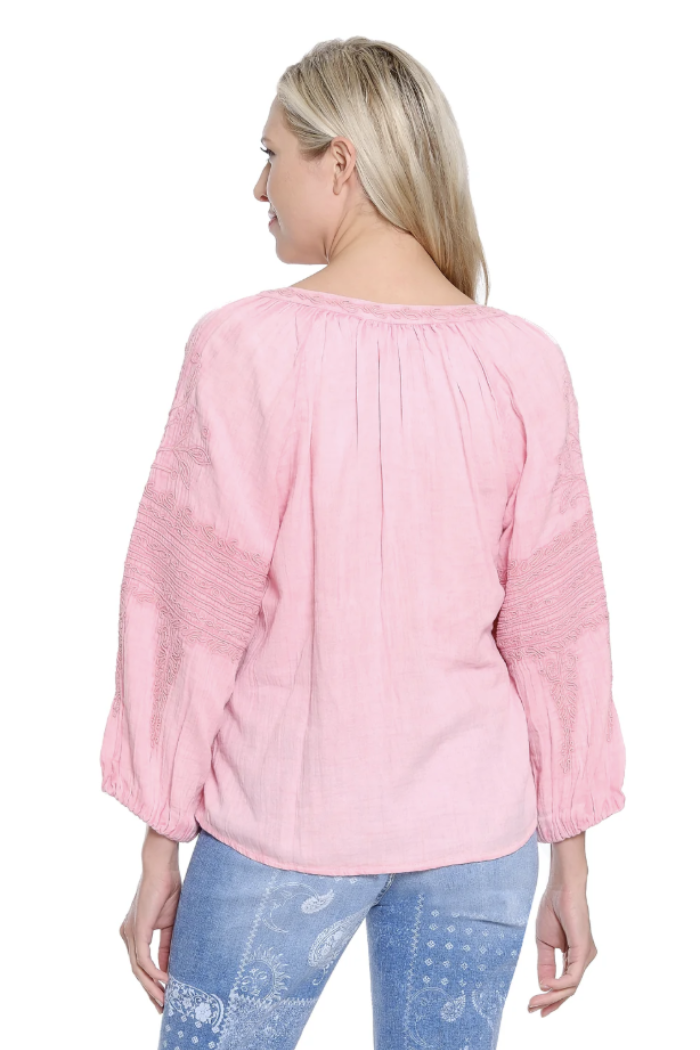 Pink Split Neck Top w/Cord Embroidery