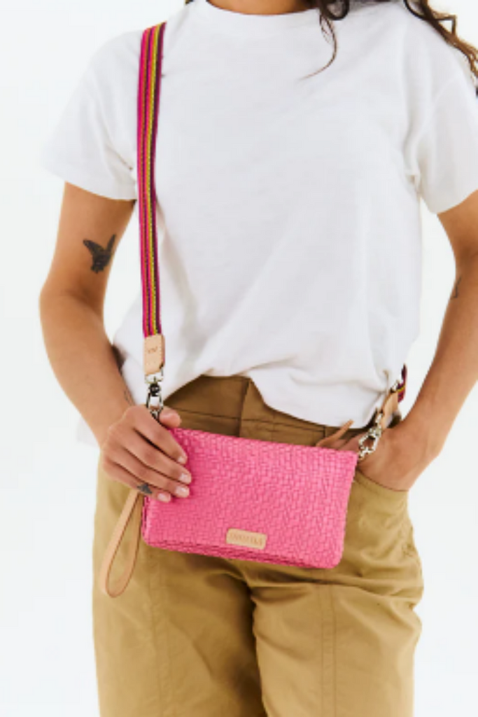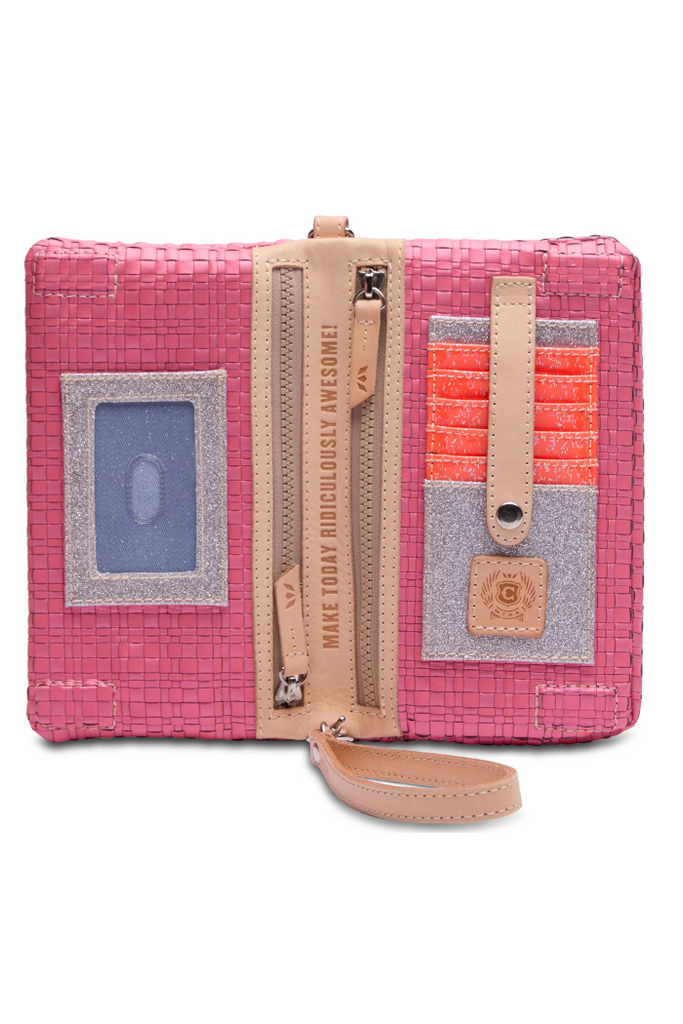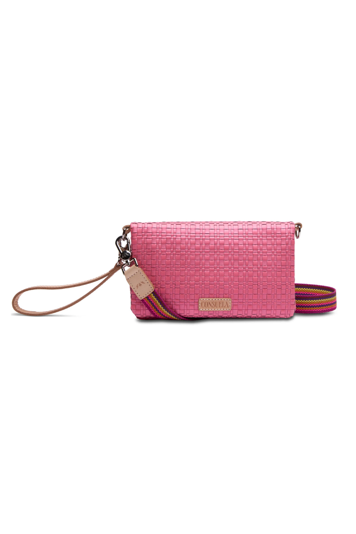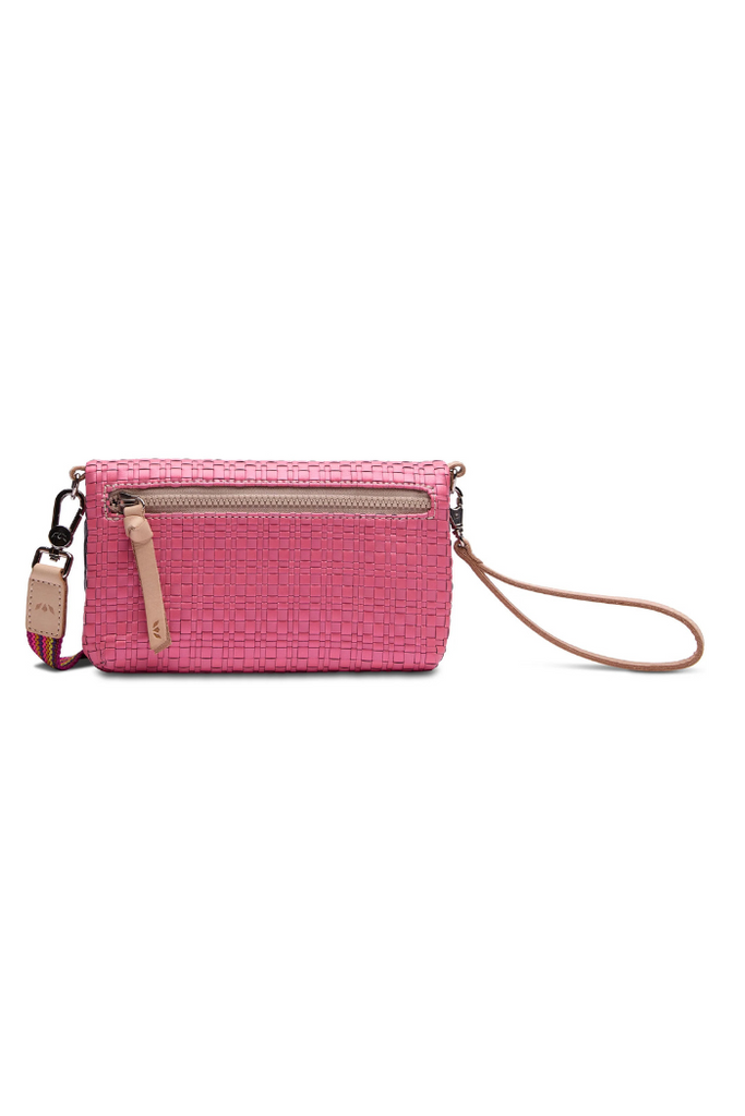- Included detachable wristlet strap and adjustable woven crossbody strap