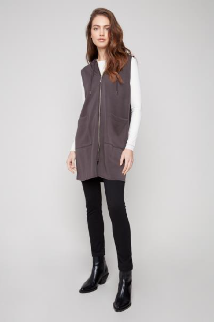 Add a layer of versatile style to your wardrobe with our Long Hooded Zip Vest. Crafted for both comfort and functionality, this vest features a soft, substantial fabric and a relaxed, elongated silhouette. The attached hood offers extra warmth and coverage, while the full zip front allows for easy on and off and customizable styling. Large patch pockets provide convenient storage for your essentials. Perfect for transitioning between seasons, this vest can be layered over long-sleeved tops, sweaters, or even light jackets for added warmth and a touch of casual sophistication. Its neutral tone makes it a versatile piece that complements a variety of outfits.