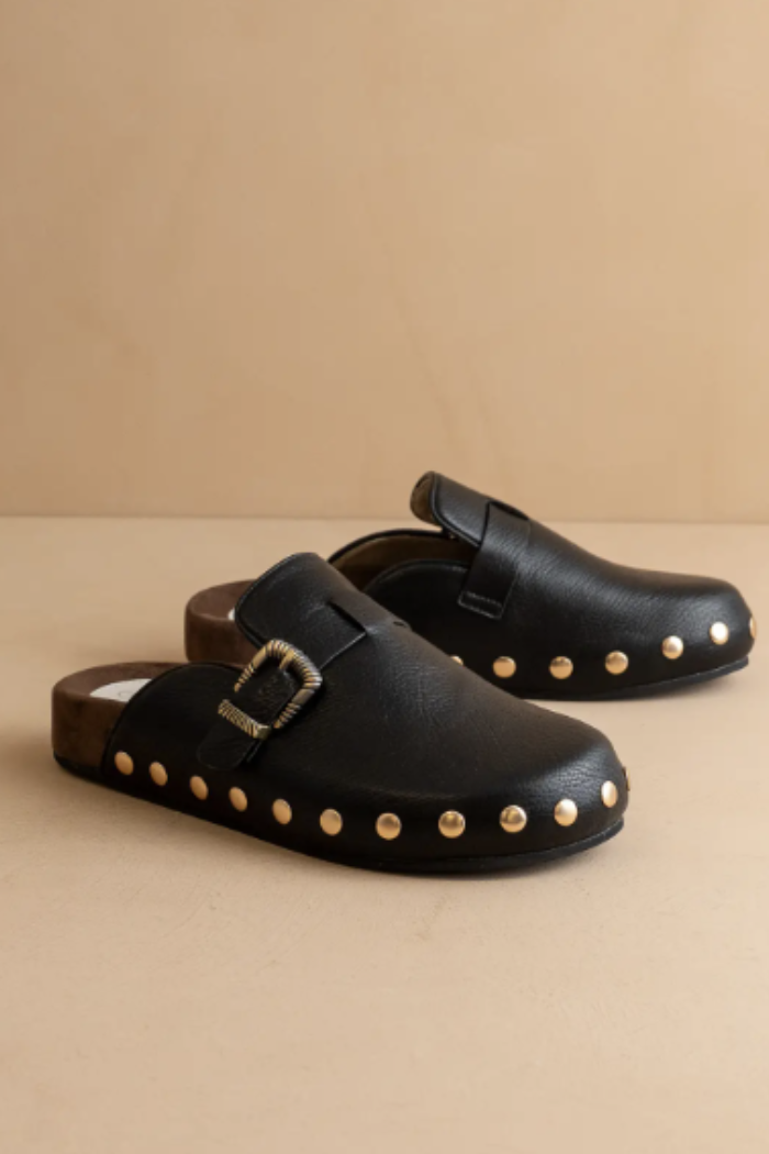 The Toni Black Studded Buckle Clog - Black / 7 is backordered and will ship as soon as it is back in stock.